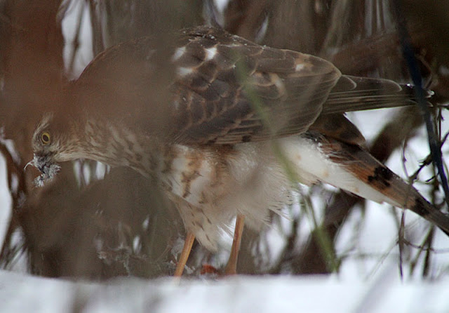 Jag fick sitta 40 minuter extra innan höken hade gjort slut på bytet och trots ben som domnade, värkte och krampade om vartannat var det värt varenda sekund. Har under den här vintern inte sett någon sparvhök på gården och plötsligt sammanfaller hökens tillslag med mitt infall att gömma mig under en presenning.