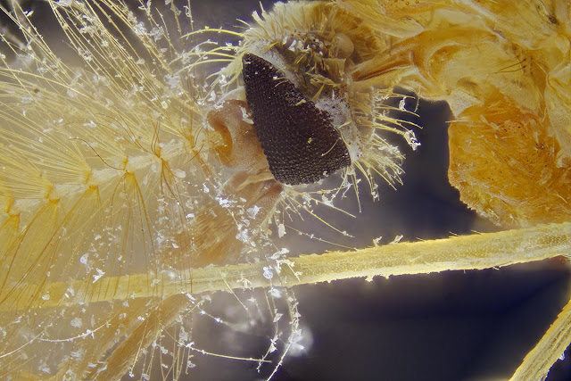 Fotograferandet för denna afton blev av det experimentella slaget. Bilden nedan är med 10x mikroskopobjektiv och 199 exponeringar. Dylika "lurviga" och spretiga motiv är egentligen inte riktigt de bäst lämpade för den linsen eftersom det blir så oerhört mycket "ljusblödningar" pga. den kraftiga o-skärpan som uppstår när det är lång fokusstackning (många bilder) i förhållande till skärpedjupet. Det är alltså rejält oskarpt längst bak när man fokuserar längst fram - och tvärtom.