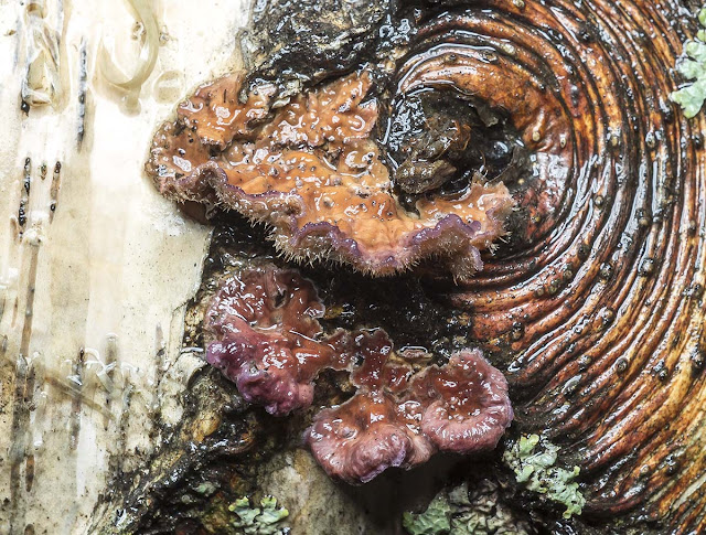 Det finns dock andra svampar som levererar fruktkroppar mer omedelbart. Chondrostereum purpureum - purpurskinn - är en som omedelbart fått fotfäste i klabbarna och som nu pryder några av sågytorna samt ett par ställen med småskador i barken.