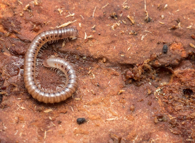 Typiska invånare under bark på liggande stammar var förstås mångfotingarna. Stenkryparen (Lithobius sp.) ovan är troligen en ung individ av ordinär brun stenkrypare, Lithobius forficatus, men artbestämning görs inte utan specifik detaljbild.