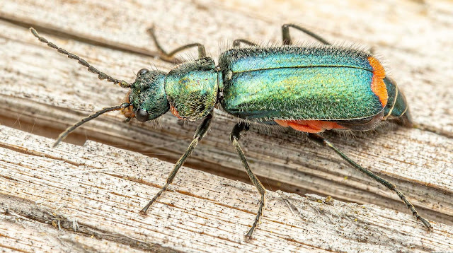 Efter "det stora fokusdebaklet på Storsand" (nämndes tyvärr aldrig i lokaltidningen) fick jag ny chans med Malachius bipustulatus ute i Bådaviken. Den här gången en hona vilket blir pedagogiskt med tanke på möjligheten att jämföra antennernas utseende med hanens i det länkade inlägget.